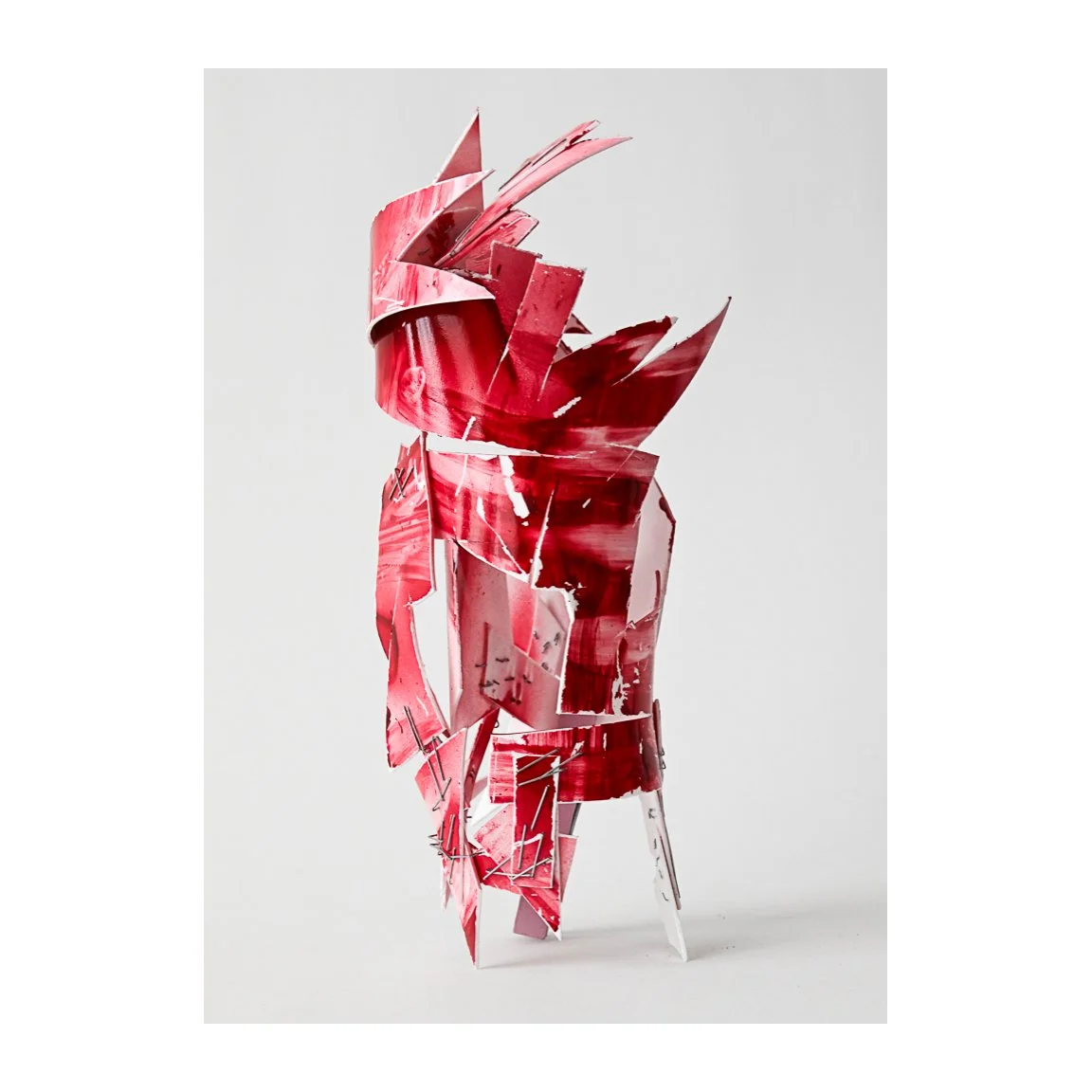 Aluminum Construction: Using materials at hand, these ephemeral constructions of plastic, cardboard, metal, and paint resist pretension, perfection, and preciousness. Each piece bears the imprint of the hand. Textures are rough-hewn, the scale intimate, the feeling expansive — even sacred.