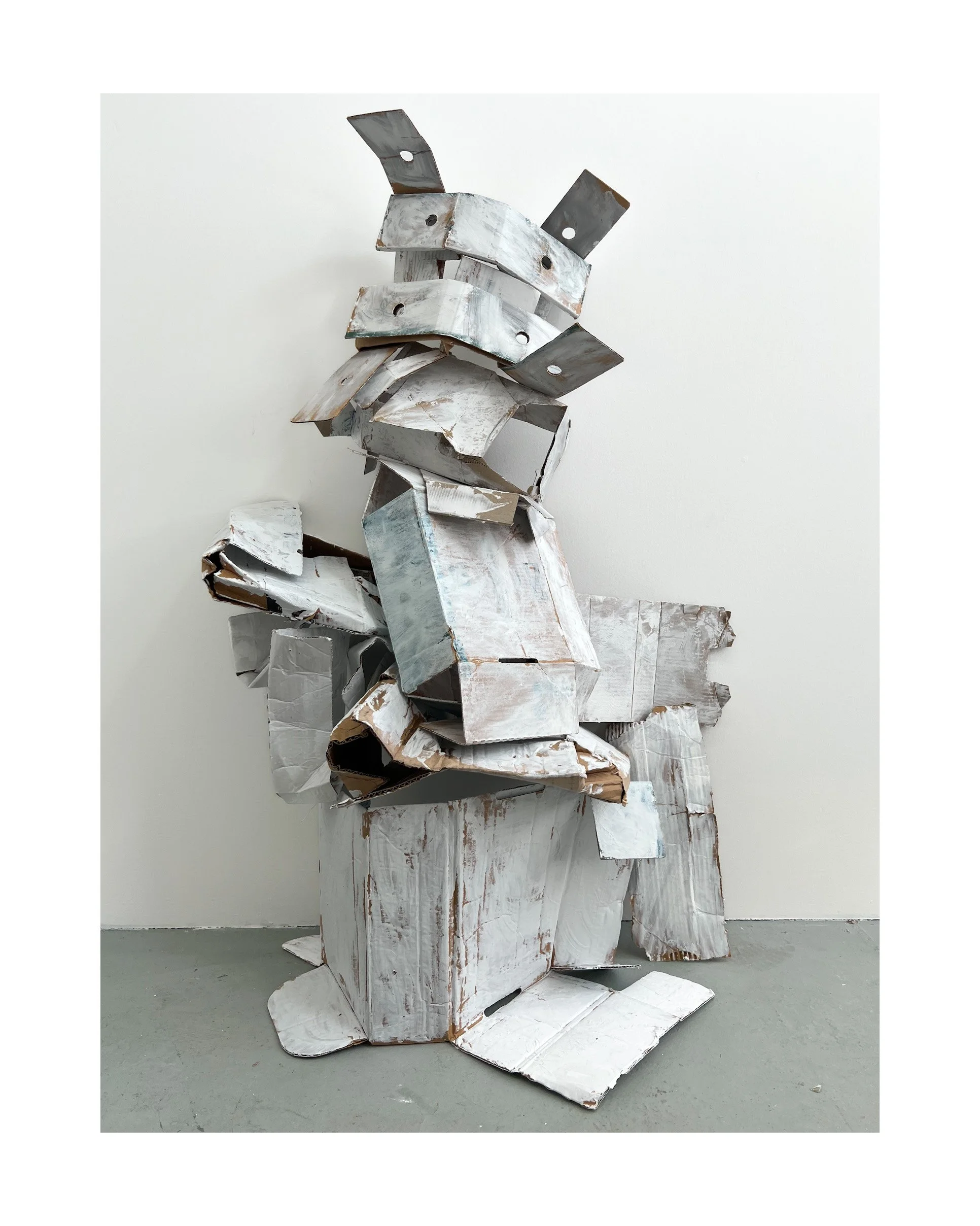 Cardboard Warrior Figure: Using materials at hand, these ephemeral constructions of plastic, cardboard, metal, and paint resist pretension, perfection, and preciousness. Each piece bears the imprint of the hand. Textures are rough-hewn, the scale intimate, the feeling expansive — even sacred.